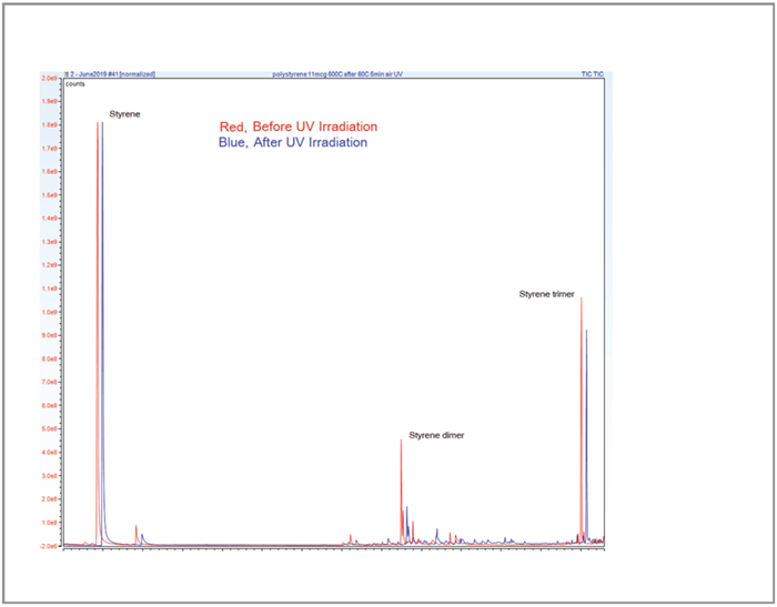 A CDS 6200 Pyroprobe equipped with Drop-In-Sample Chamber (DISC) and Photoprobe was used, and an autosampler module was installed to automate the weathering-pyrolysis sequence. 11 μg of polystyrene was irradiated in the DISC with the presence of air as reactant gas at a flow rate of 10 ml/min. The volatiles generated from the photoreaction were trapped on the analytical trap, and then desorbed to the GC-MS after the photoreaction is completed. The remaining polymer was pyrolyzed at 600°C as the last step. A DISC quartz tube was used as the sample vessel.