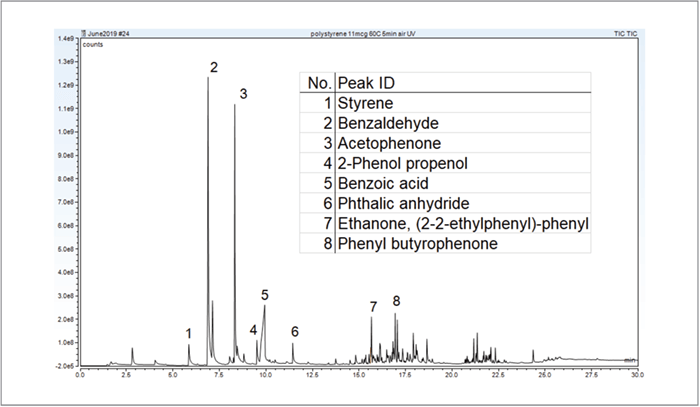 Weathering studies of polymers with the Photoprobe took minimal time – on the scale of minutes compared to hours with traditional techniques. Polystyrene under UV irradiation and an air atmosphere at a 60°C set-point produces many UV thermal oxidative degradation products, ranging from volatile to non-volatile components. The resulting chromatogram is shown in Figure 1.