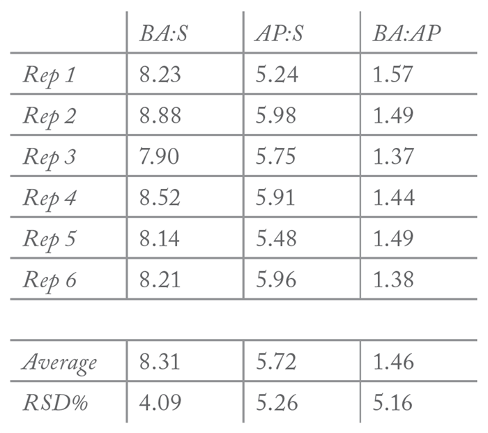 Six replicates of the volatiles from weathering polystyrene provided area ratio RSDs ≤5.25 percent for Benzaldehyde, Acetophenone and Styrene (Table 1). After this degradation analysis, the remaining degraded polymer was automatically pyrolyzed and studied with a second GC-MS run (Figure 2). Six replicates of the pyrolysis of weathered polystyrene produced an area ratio RSD of 3 percent.