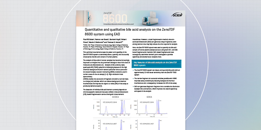 This application note demonstrates the use of the ZenoTOF 8600 system to quantify the bile acid content in human plasma sample extracts, employing both CID- and EAD-based fragmentation methods. EAD-based fragmentation was strategically used when isomeric pairs overlapped to provide specificity and enable faster analysis times.