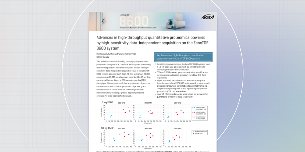 This application note describes high-throughput quantitative proteomics using the ZenoTOF 8600 system. Combining improved separations and high-sensitivity data-independent acquisition (DIA), as many as 26,000 precursors and 4,000 protein groups were identified from a 5 ng commercial human digest at a 500 samples-per-day (SPD) throughput.