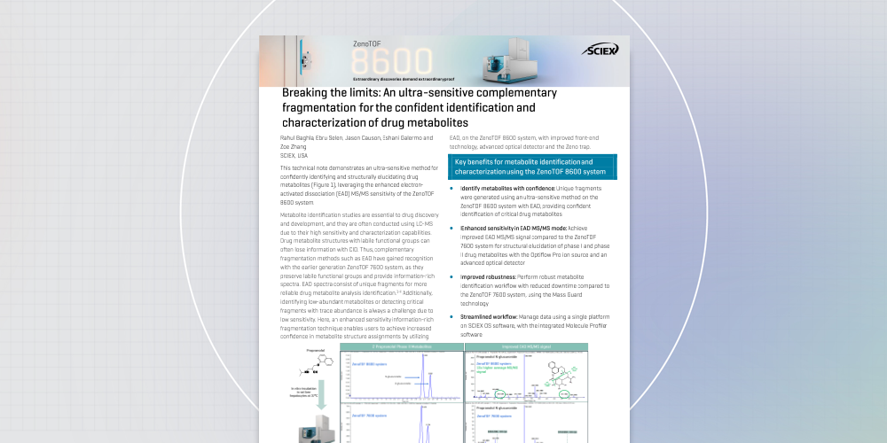This application note demonstrates an ultra-sensitive method for confidently identifying and structurally elucidating drug metabolites, leveraging the enhanced MS1 and electron-activated dissociation (EAD) MS/MS sensitivity of the ZenoTOF 8600 system.