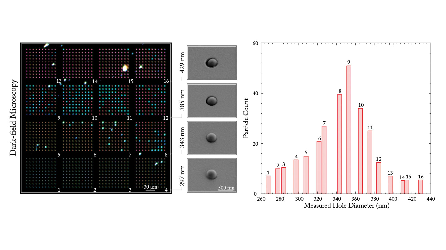 The researchers first edge cylindrical hole cavities into a semiconductor substrate. Then, when a liquid containing nanoplastics is deposited onto the optical sieve, the particles remain trapped in holes of matching size – much like a classical sieve – which changes the color observed under the light microscope. By carefully tuning the hole dimensions, the researchers can extract information about the size, distribution, and number of the particles.