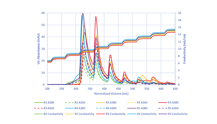 We were ecstatic to see the small conductivity step-approach begin to split what originally were small broad peaks into sharper, defined elution peaks. As we performed additional runs of the method and fine-tuned the buffer compositions for our AAV5 constructs, we were satisfied with what was achieved. Using these discrete conductivity steps with membrane chromatography has enabled these successes with AAV and may be highly impactful for gene therapy manufacturing and production.