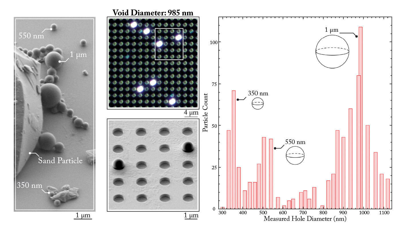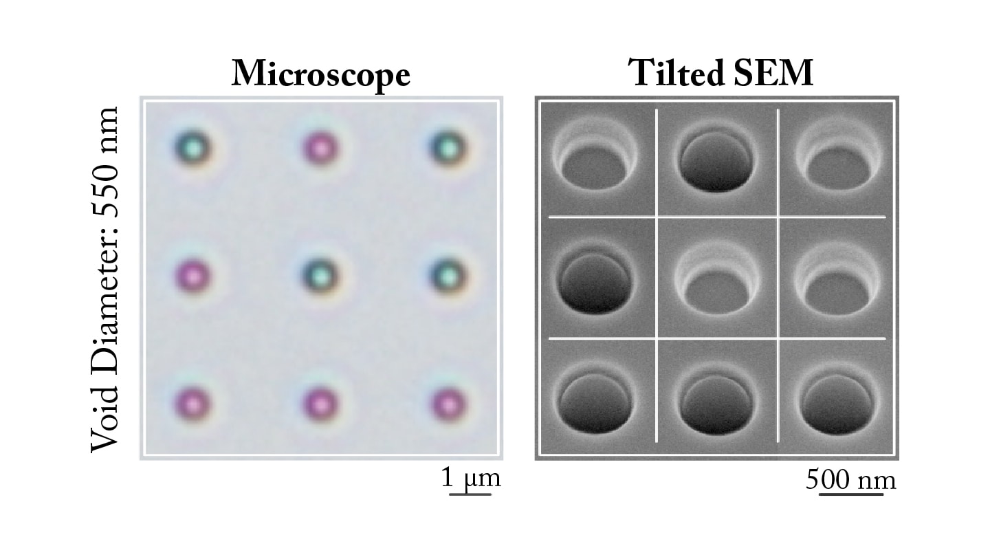 The researchers first edge cylindrical hole cavities into a semiconductor substrate. Then, when a liquid containing nanoplastics is deposited onto the optical sieve, the particles remain trapped in holes of matching size – much like a classical sieve – which changes the color observed under the light microscope. By carefully tuning the hole dimensions, the researchers can extract information about the size, distribution, and number of the particles.