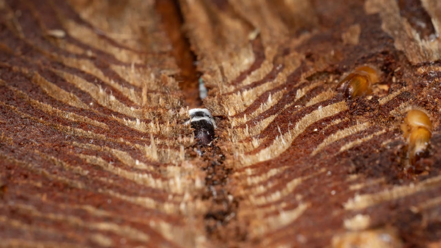 A striking glimpse beneath the bark of a Norway spruce reveals adult spruce bark beetles (Ips typographus) tunneling through their galleries – with one individual (center) overtaken by the insect-pathogenic fungus Beauveria bassiana. The image captures a moment in a hidden chemical battle that plays out inside forest ecosystems, where trees, insects, and microbes are locked in an ongoing evolutionary arms race.