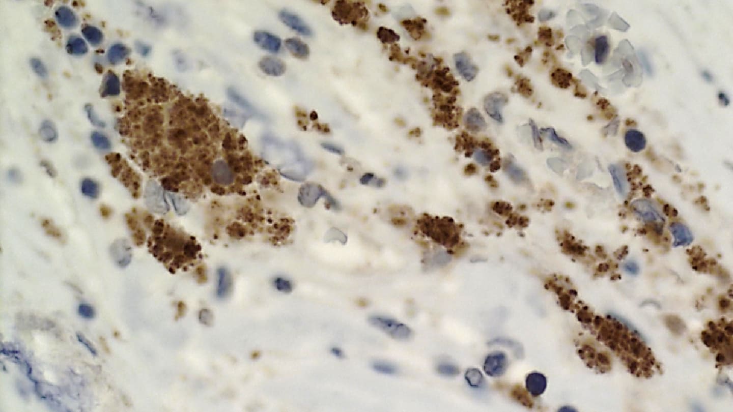 We also encountered significant technical difficulties when preparing the heavily calcified arterial samples for histology. Sectioning them on a microtome and ensuring the sections adhered to slides proved challenging. The samples required up to two weeks of EDTA decalcification, and EDTA had to be applied directly to the block immediately before cutting to obtain sections with as little fragmentation as possible. It also took time to identify microscope slides capable of holding these sections effectively. Extracting DNA from calcified tissue was similarly demanding and required extensive optimization.